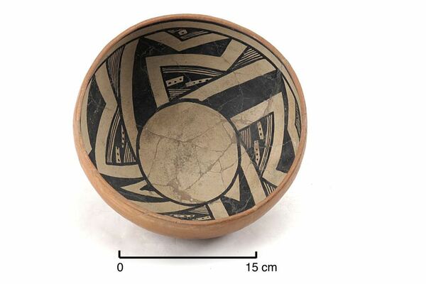 Pinto Polychrome was defined by Gladwin and Gladwin (1930). This type represents the earliest Salado polychrome type and is reflected almost exclusively by bowl forms (Crown 1994; Lindsay and Jennings 1968). Pinto Polychrome has the most limited distribution of the Salado Polychrome types and occurs in a corridor from east-central to southeastern Arizona and is very rare but may occur in site in west-central New Mexico. Pinto Polychrome was produced during the late thirteenth and early fourteenth century. The interior bowl surface is covered by a poorly to well-polished red slip while interiors are covered by a polished pearly-white to pinkish slip. The red slip commonly covers the entire exterior surface but may be limited to band just below the rim. The white interior is decorated with designs in a black organic paint. Interiors are commonly decorated with opposed solid and hatched designs. These designs are organized in broad rectilinear or curvilinear motifs that include broad and fine lines and closely spaced hachure. Designs usually begin from the bowl rim and commonly fill the entire interior surface, although a small circular area near the center may be left unpainted. These designs are similar to those noted in St Johns (Tularosa style) Black-on-white. Exterior surfaces may be sometimes decorated with black paint or white clay slips. Those in white slip tend to be thick and similar to those occurring in interiors of St Johns Polychrome and indicate relationship between these types.